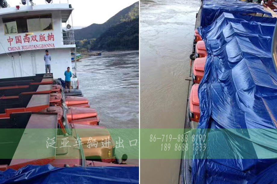 2019年4月21日 由湄公河船运出口金三角区域的10辆东风自卸越野专用车顺利交付装船.